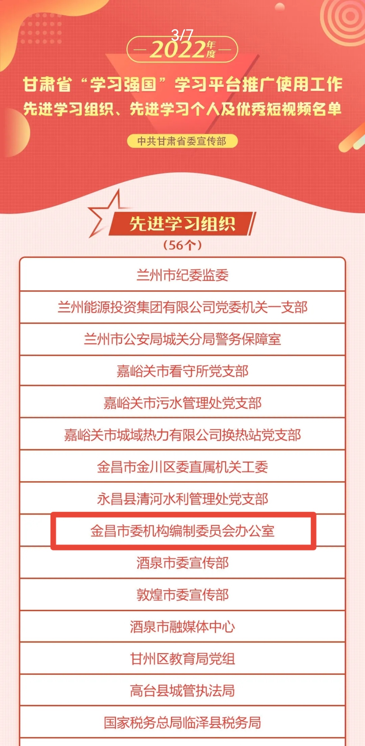 近日,金昌市委编办荣获中共甘肃省委宣传部授予的全省“学习强国”学习平台推广使用工作先进学习组织荣誉称号并通报表扬。